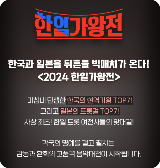 한일가왕전 방송 채널은 MBN에서 방영되며 4월 2일 화요일 밤 10시에 첫방송이 되며 매주 화요일 밤 10시 시간에 방송이 됩니다. 국민의 손으로 탄생한 한국과 일본 트롯대표 top7이 자국 문화 명예를 걸고 편치는 음악 예능 프로그램입니다. 재방송 다시 보기 편성표는 참고 바랍니다.